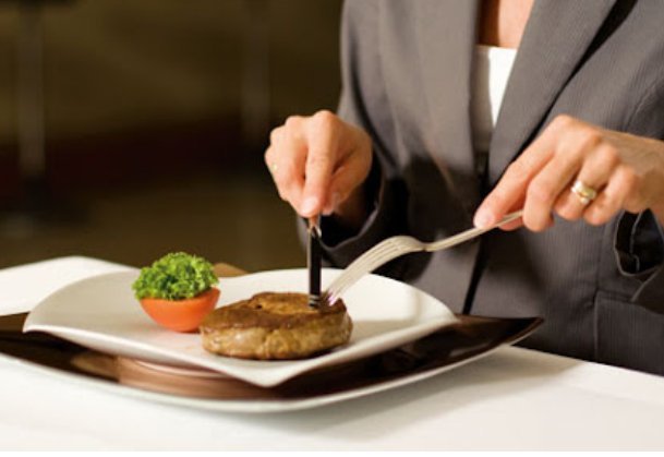Храната се избутва с вилицата по посока ножа, ножа стои като преграда, опора за вилицата, не се ползва за да се сложи хапката на вилицата. Вилицата се поставя в края на нещото, което ще режеш за да може парчето, което отрежеш да е малко и да го лапнеш директно.