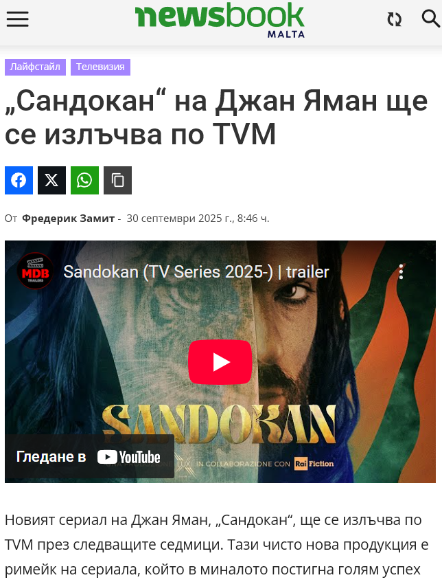 Сандокан скоро ще се излъчва по телевизията в МАЛТА, след премиерата в Италия, по канал TVM в четвъртък вечер от 22:00 часа на дата, която ще бъде обявена скоро!