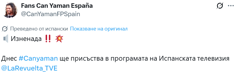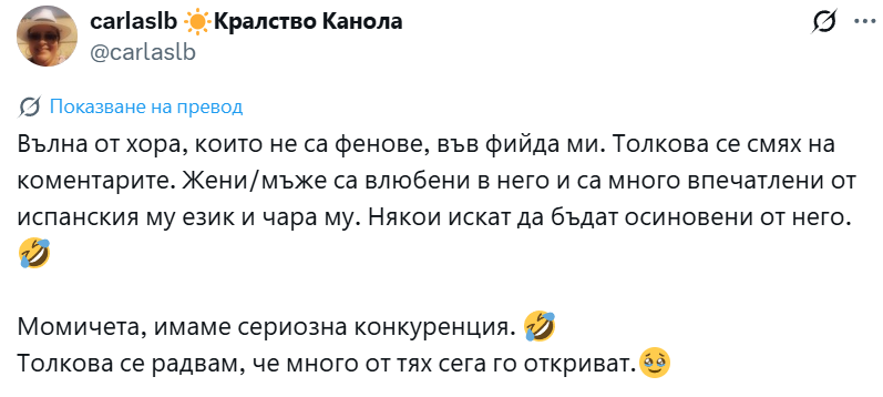 А в ТТ/ИГ наистина се случва нещо необичайно Flushed и все още продължава.. испанците са много готин и весел народ, прочетох много коментари, те са във възторг. И дори тези, които не са го познавали са попаднали в мрежата му.Grinning  Много смешни коментари има, особено тези от мъже, така не съм се смяла от години! Joy