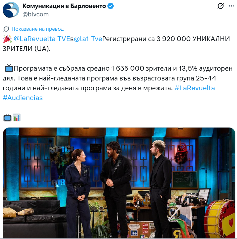 И веднага го канят и то в държавната телевизия, в едно рейтингово токшоу, което има над 2 милиона зрители и 5,8 - 6 милиона гледания в платформата...Sunglasses (за цифрите източник е Ленка)