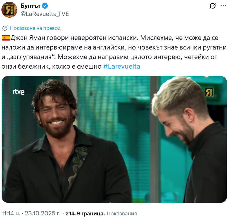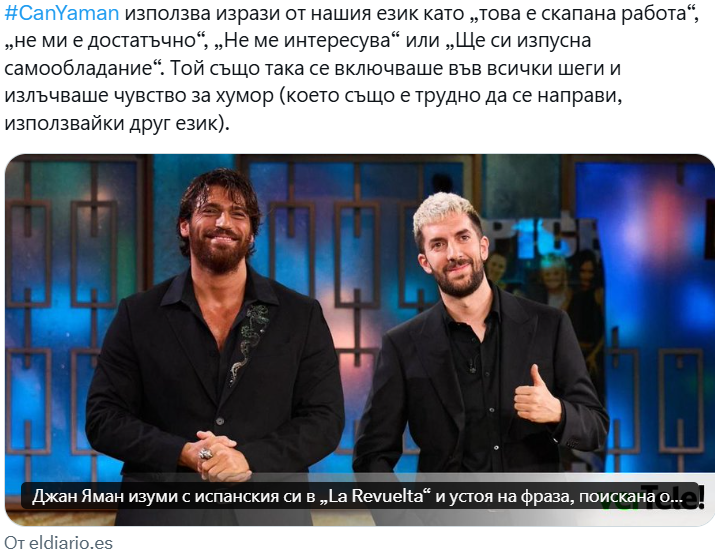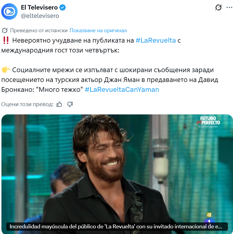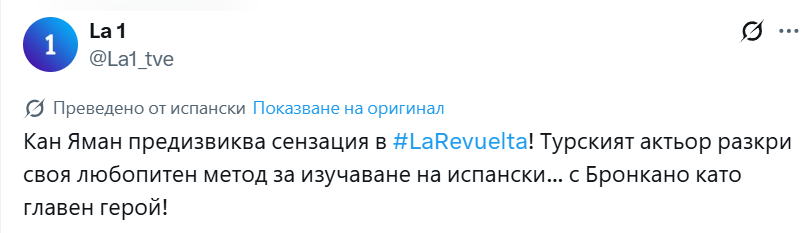 Бронкано даде обещание на международна звезда и го спази. Турският актьор Джан Яман , който разпалва страст, където и да отиде, посещава „Ла Ревуелта“ по време на престоя си в Мадрид, за да снима сериал. Но това, което никой не очакваше, беше, че само за една година подготовка ще постигне такова майсторство по испански... и още по-малко Бронкано да има нещо общо с това: „Всичко на испански, моля, нищо на английски.“