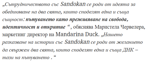 Sandokan и Compagnia delle Indie образуват естествена и непосредствена двойка: два свята, обединени от привлекателността на екзотичните пътувания, откриването на съкровища, подправки и уникални аромати. Тези сетивни емоции се възраждат днес в ексклузивната колекция Compagnia delle Indie за Sandokan: лимитирано издание, създадено да разкаже история за приключения, елегантност и далечни вдъхновения“, обяснява Пино Калипари, главен изпълнителен директор на MyLuna, групата, която наскоро придоби и рестартира марката Compagnia delle Indie.