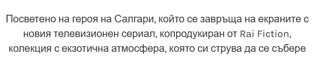 Петдесет години след известния сериал, който го направи икона, героят на Емилио Салгари се завръща в праймтайма на Rai 1 и на RaiPlay. Една вечна история, която пренася зрителите в екзотични земи и далечни времена, точно както ароматите на Compagnia delle Indie пренасят потребителите в неизследвани светове на въображението.