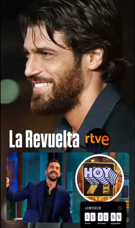 (Източник: фенове, които разговаряха с актьора вчера) La Revuelta е испанско късно вечерно токшоу по La 1, водещият канал на обществения оператор RTVE (Televisión Española). Водещ е комикът Дейвид Бронкано и се излъчва от понеделник до четвъртък в 21:40 ч., веднага след вечерните новини (Telediario), и е продуцирано в сътрудничество с El Terrat и Encofrados Encofrasa. Шоуто се заснема на живо от Teatro Príncipe Gran Vía в Мадрид и включва комбинация от интервюта със знаменитости, комедийни скечове, музикални изпълнения и интерактивни сегменти с публиката.