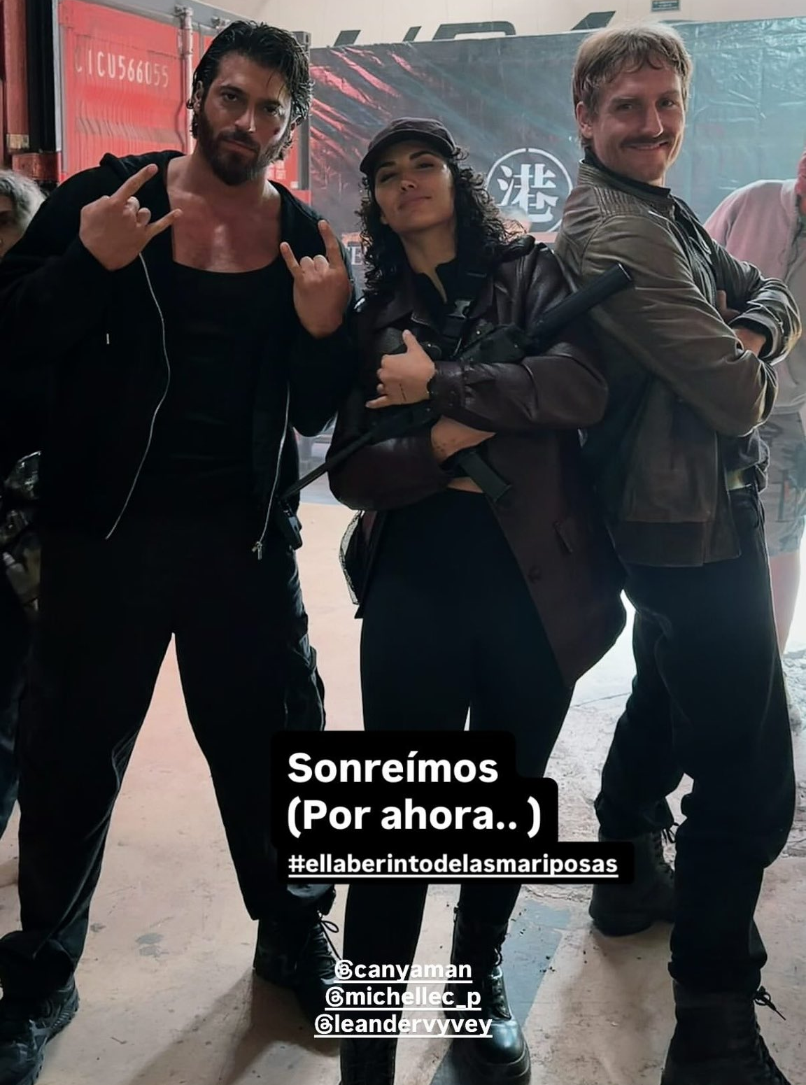 Джан с колегите си от актьорския състав: Леандър Вайви и Мишел Калво от снимачната площадка на новия му испански сериал: El Laberinto de las Marip  🦋🦋🦋