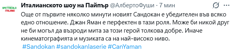 Да, има десетки други актьори, които са се превърнали в известни имена в Италия, Испания и много други страни благодарение на турските сапунени опери. Но не всички имат качествата на Джан Яман. Въпреки че може да звучи налудничаво, потенциалът, който се разгръща, вероятно ще го постави като наследник на Брад Пит, особено ако този нов SANDOKAN се представи добре в Disney+, носейки вълната към англоезичната публика.