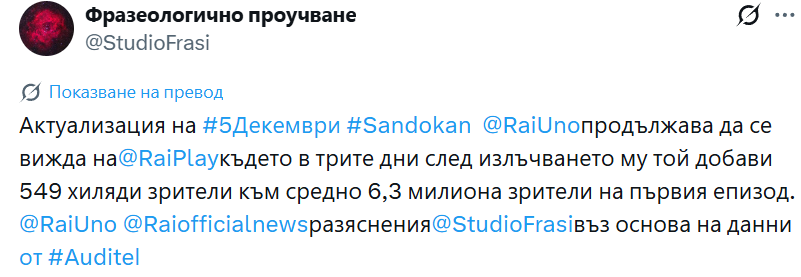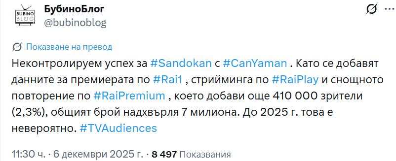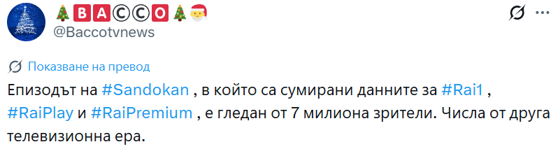 Новият сериал „Сандокан“ се представи премиерно в Италия по Rai - Radiotelevisione Italiana в понеделник, постигайки изключителен дял от 34%.