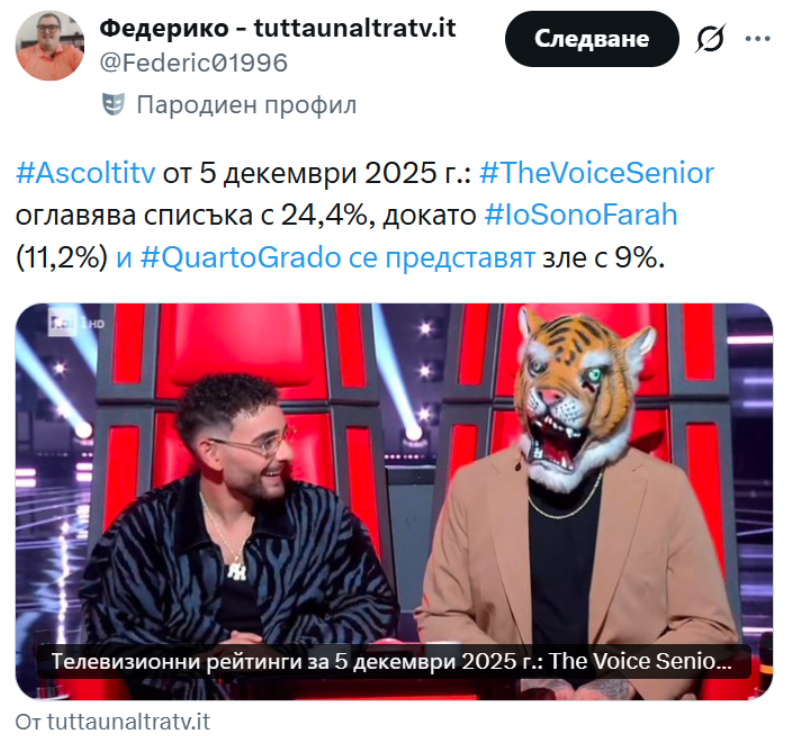 Фиорело се облече като Сандокан, а от Гласът на Италия си сложиха глава на тигър.