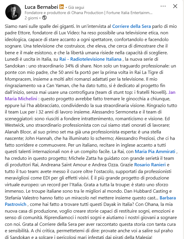 Това не е просто професионално постижение: това е мост към баща ми, който преди 50 години представи „Тигърът от Момпрацем“ за първи път в Rai, заедно с много други романи, адаптирани за телевизия.