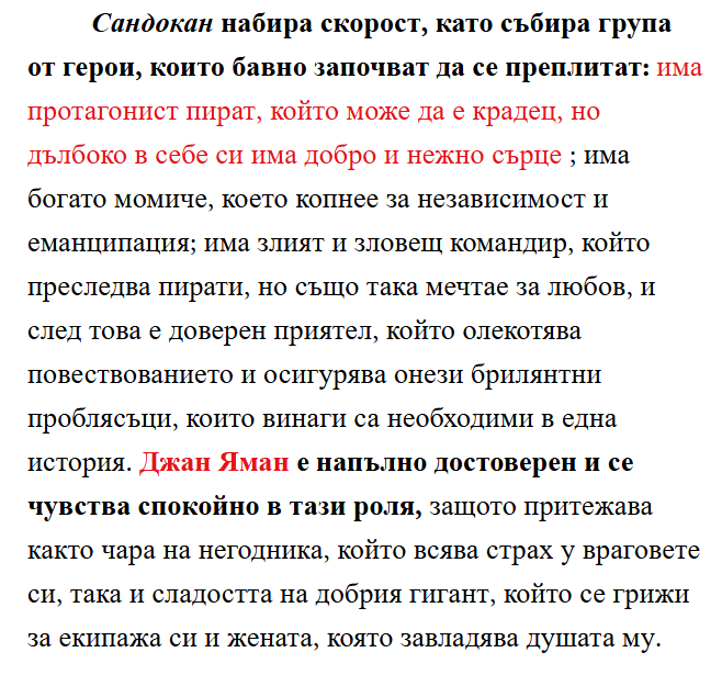 ДЖАН ЯМАН: За да постигнеш свобода, трябва да си силен, готов на жертви, никога да не губиш гордост и спокойствие. В многобройни ретроспекции ще видим в какво семейство и среда е израснал Сандокан. Той е човек без вътрешни конфликти, силен, свободен, независим от нищо. Но той е и професионален алтбруксист, човек, който мечтае да подобри живота на другите, започвайки със семейството си. Той не се бори за свобода, а за правата на другите, за по-висша ценност. До степен да рискува собственото си съществуване и да промени посоката си, посвещавайки се на независимостта на цяло население. Именно тук откриваме цялата му модерност, пример за подражание. Защото свободата изисква сила, жертва и идеал, по-голям от самия теб.