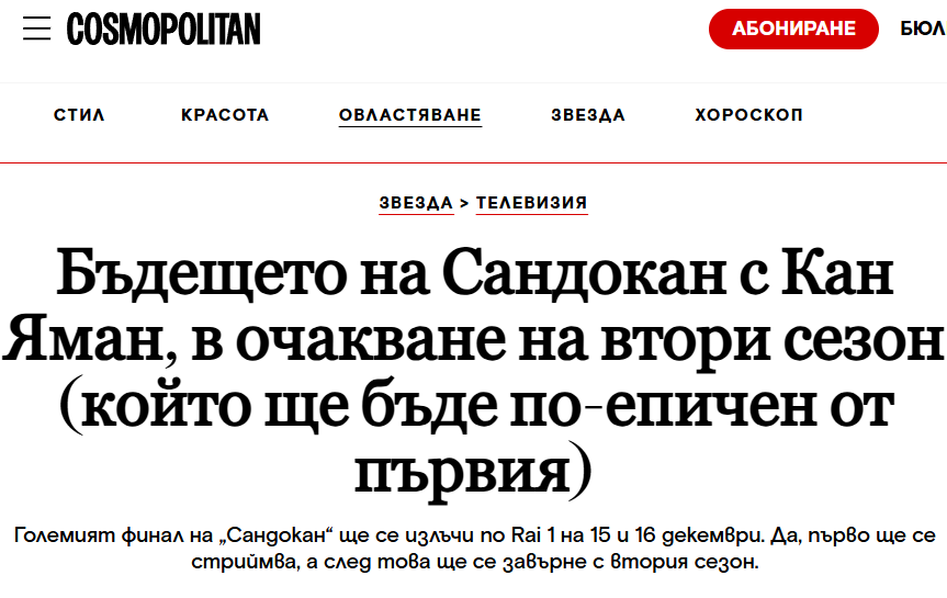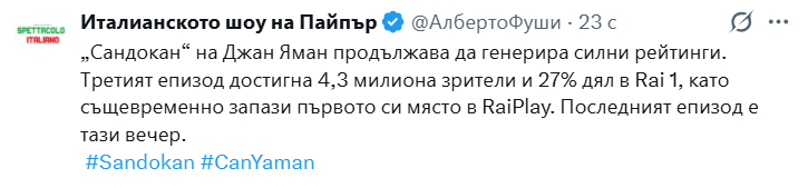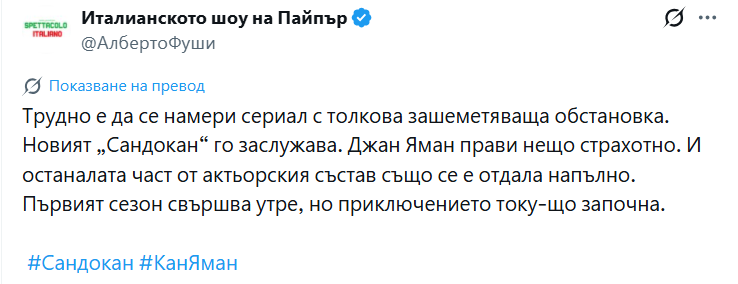 Епизод след епизод, сцена след сцена, продължава да се надминава в изразителност, не само с погледа и лицето си, но и с цялото си тяло... Тези два епизода бяха влакче на емоциите! Утре вечер ни чакат последните два, които още повече ще ни разтърсят - сцената с пребития Сандокан предстои, ще ревем яко