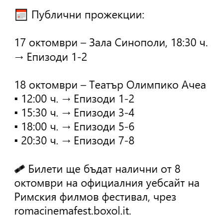♦️18/10 Teatro Olimpico Acea 15:30 ч. - 6 € - Публичен достъп (Еп. 3 и 4 - 114 мин.)