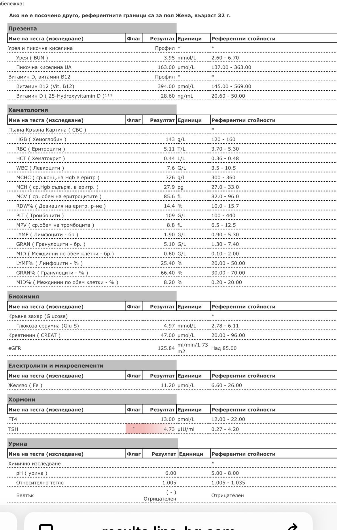 Пусни целия т.н. Железен панел , след като поне 10-на дни приемаш повече вода ( 3-4л. на ден)... защото си дехидратирана и някои от показателите може да не са обективни - напр. Хемоглобин.
