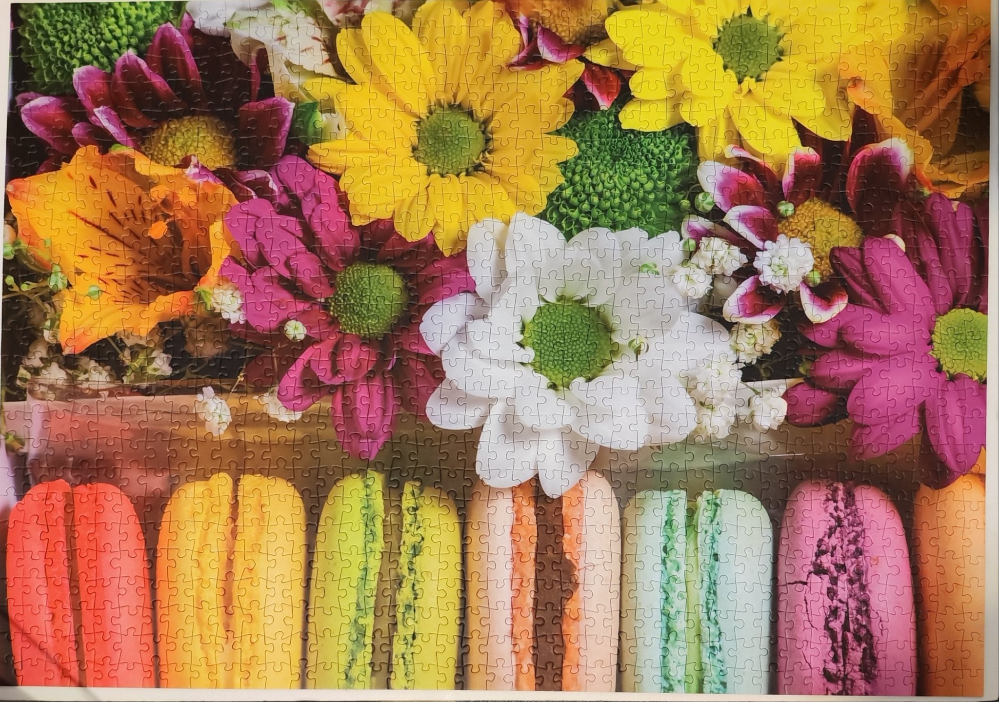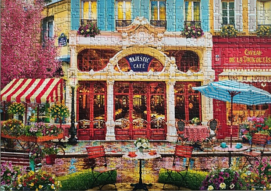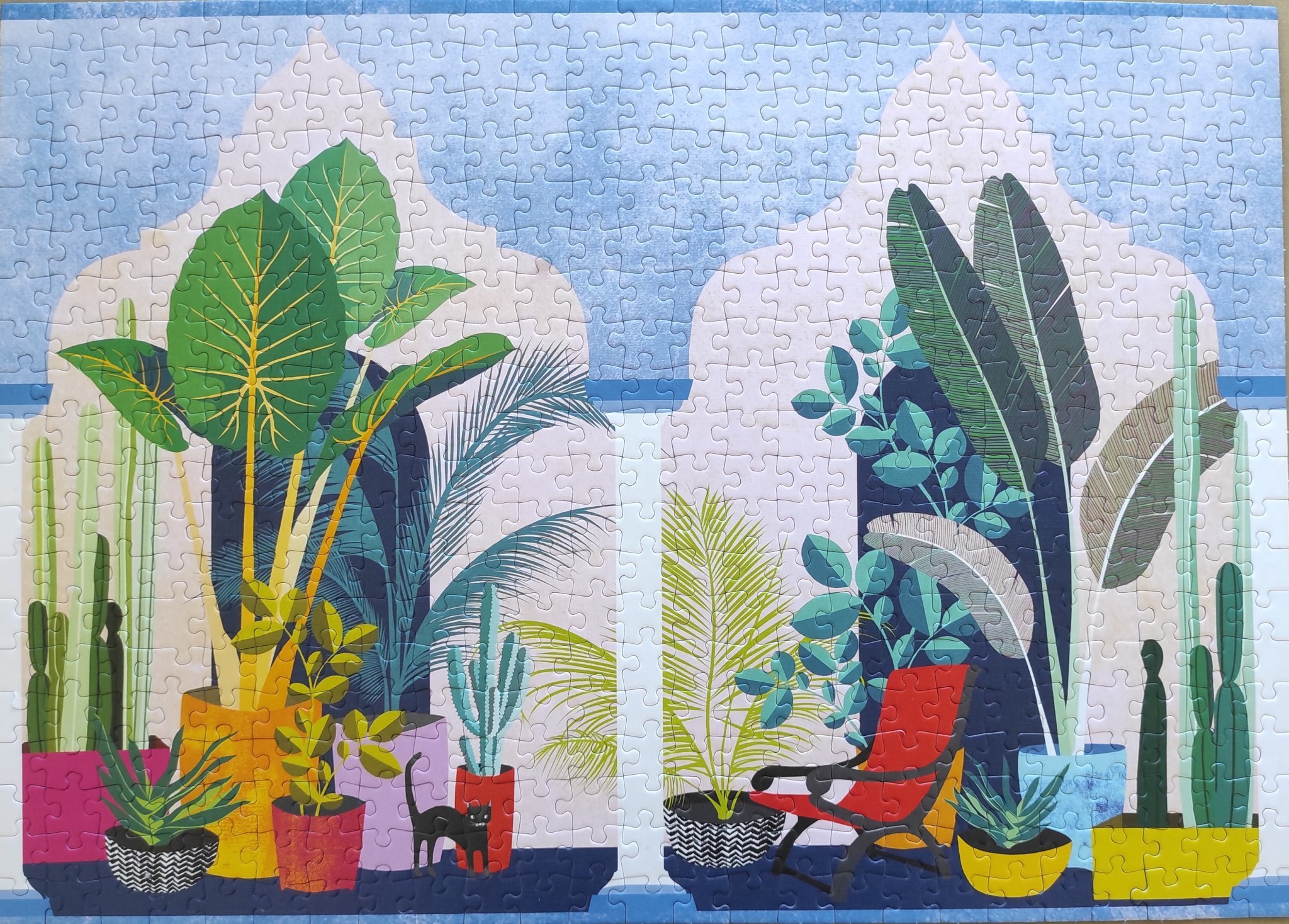 Чета тука как хората мятат по един пъзел 500 части с кафето, аз този го редих 1 месец. Реално ми отне 3 вечери по 1-2 часа: 1 вечер сортирах и редих рамка, 1 вечер наредих синият таван по форма и още 1 вечер саксиите с цветята. Мъжът ми ме го хареса, но ще го закача някъде.