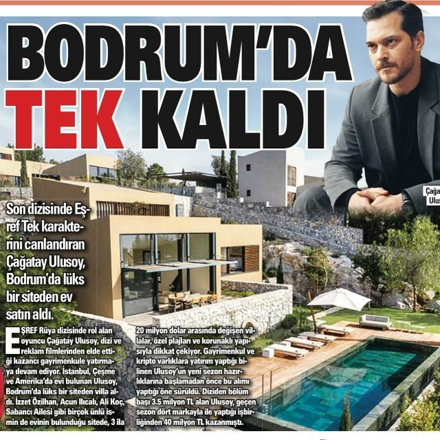 💫Турската преса твърди, че Чаатай Улусой е купил вила в елитен комплекс в Бодрум с частен плаж. Цената на недвижимите имоти в проекта достига 20 милиона долара. Актьорът получава 3,5 милиона лири на епизод, а наскоро е спечелил 40 милиона лири от рекламен договор. Любопитно е в каква реклама ще участва известният актьор.