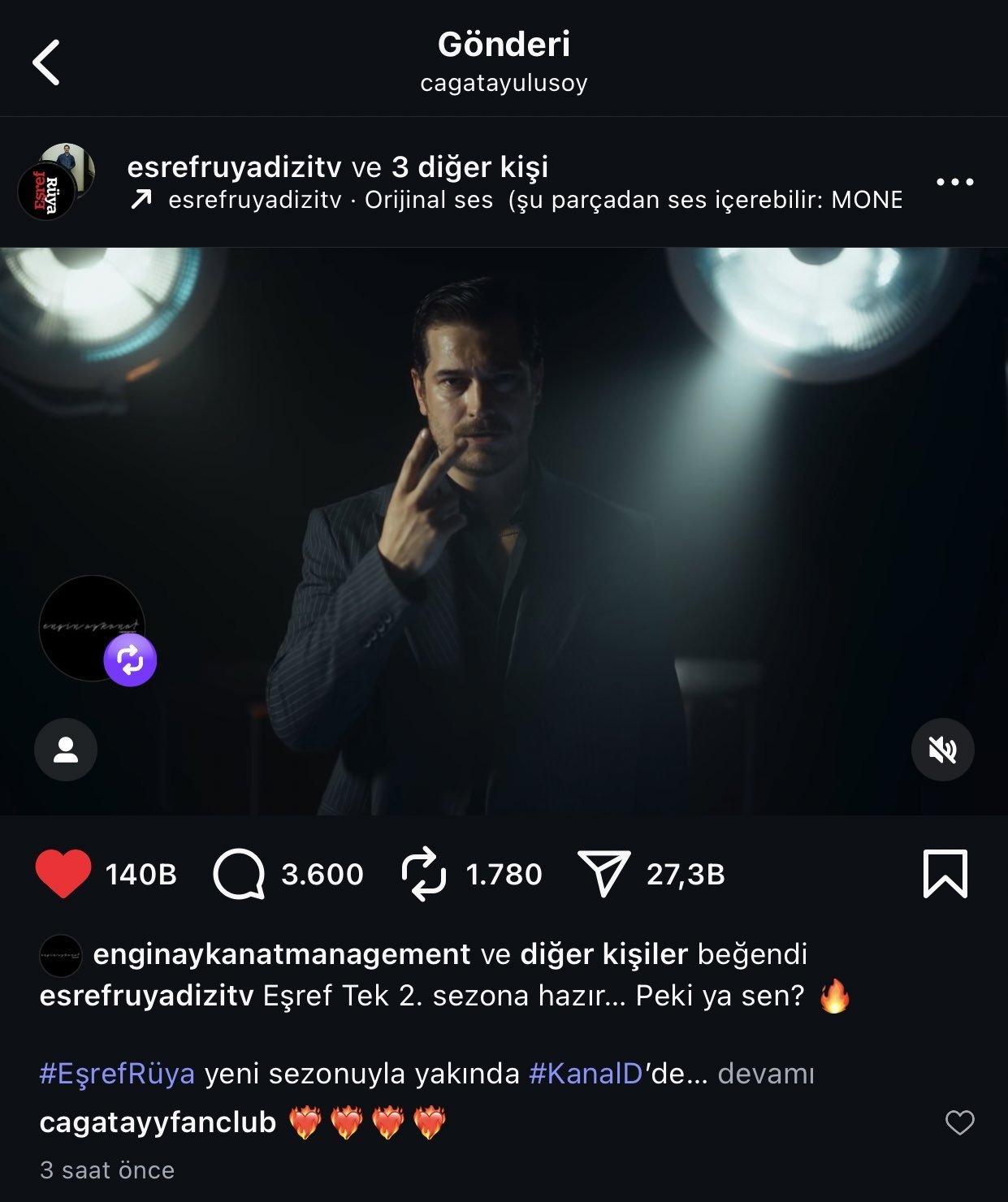 Мениджъра Енгин Айканат също го е отразил заедно с Чаатай , продуцентската компания, канала и официалният профил на сериала.