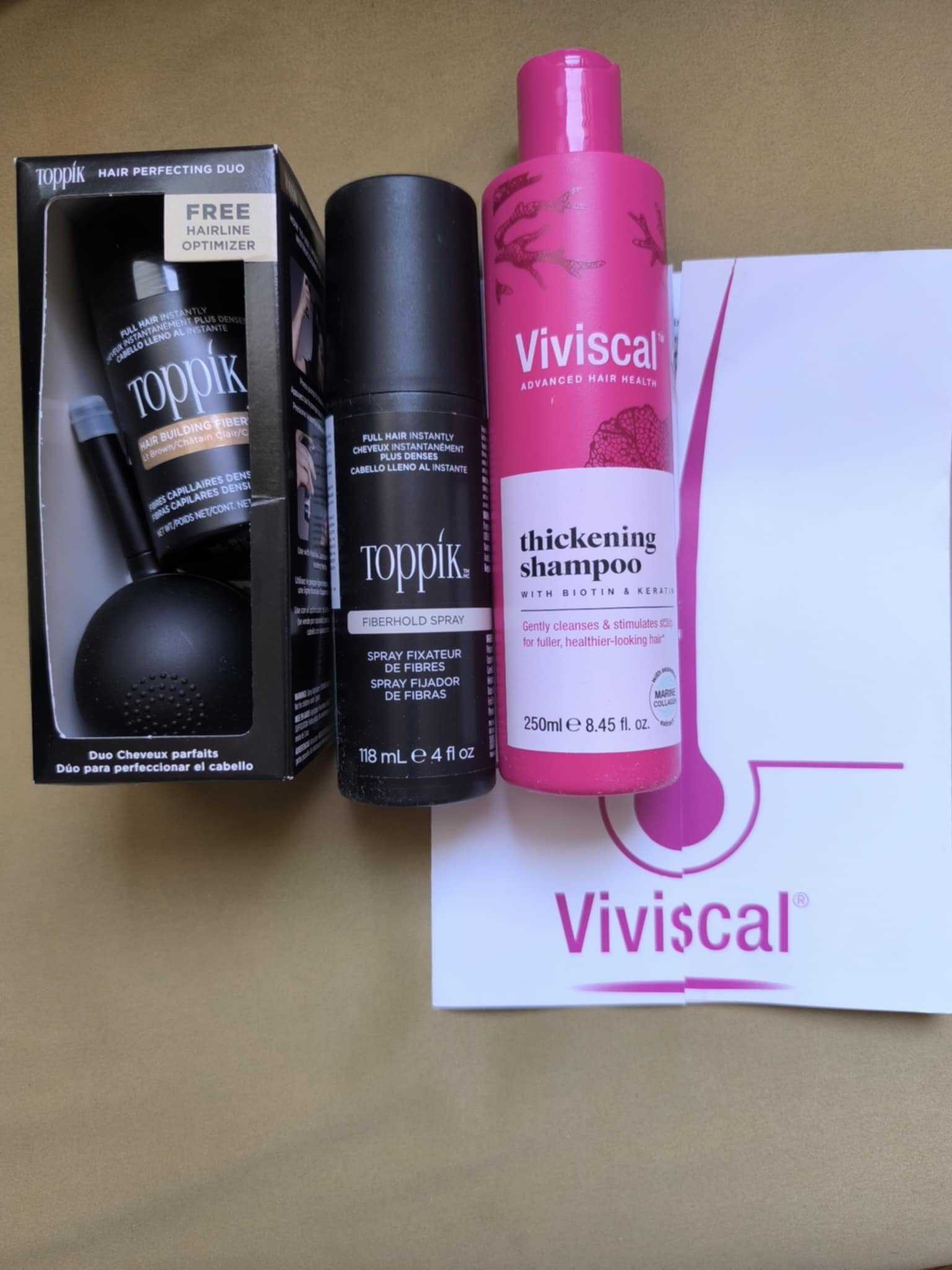 Продуктите, които получих, са:  Toppik комплект за стилизиране 2 части, включващ Спрей апликатор и Оптимизатор за линията на косата, Фиксиращ спрей и шампоан за жени Viviscal.