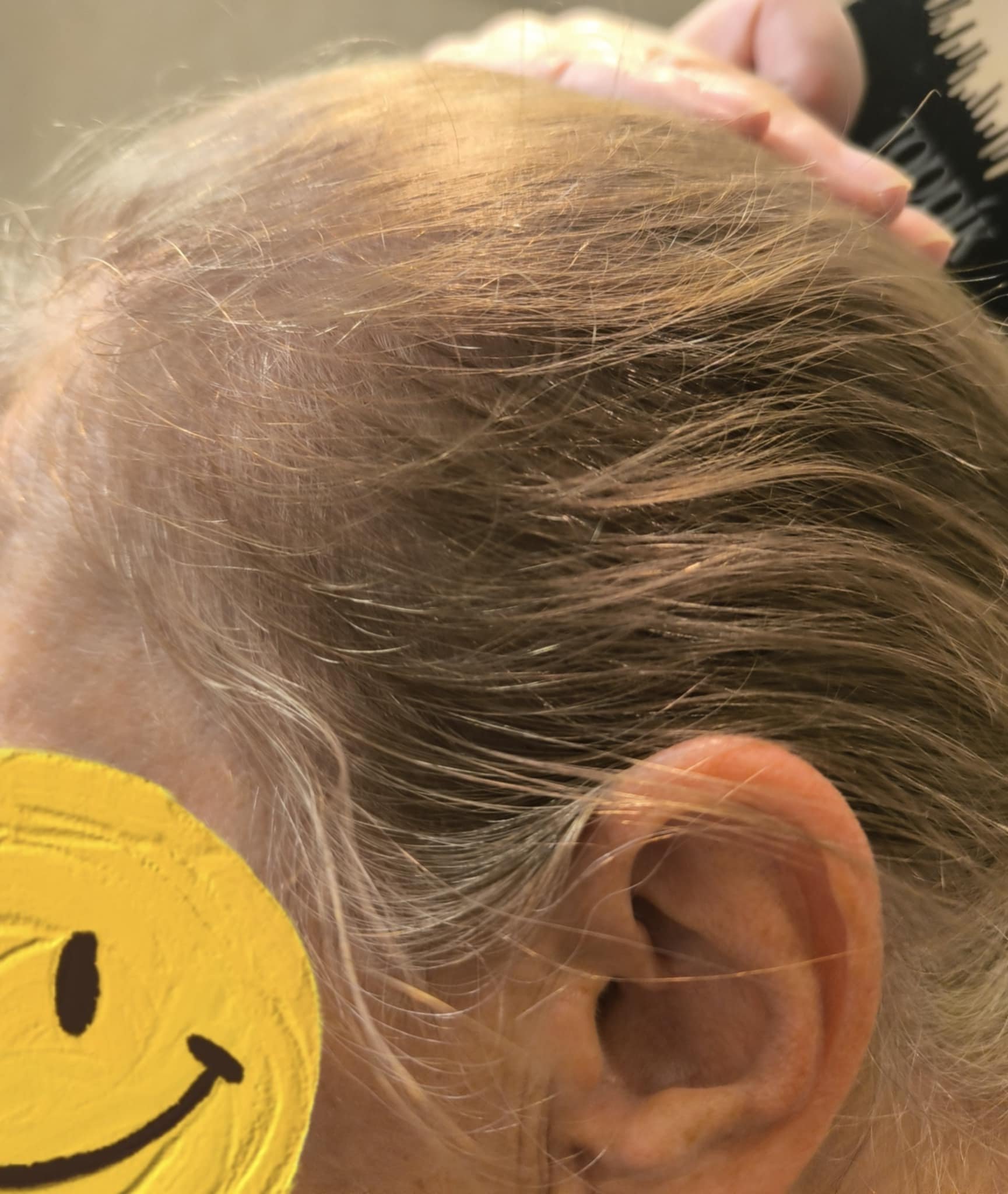 Нанасям продукта основно в горната част на главата ми, като от дясната ми страна имам малко по-рядък участък. След нанасяне тази проблемна част изглежда така, сякаш си гледам косата отпреди десет години. На живо изобщо не се забелязва, че съм използвала някакъв продукт, а при допир косата не се усеща лепкава или утежнена.