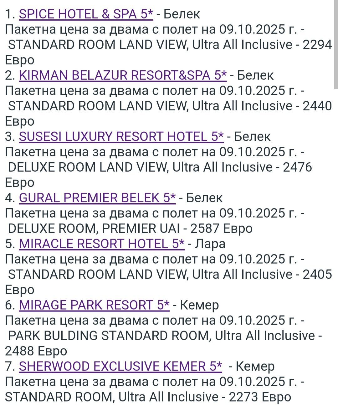 Kamelya и Ali bay,не ми ги дова с полет от Пловдив.Сега ще погледна и Megasaray.