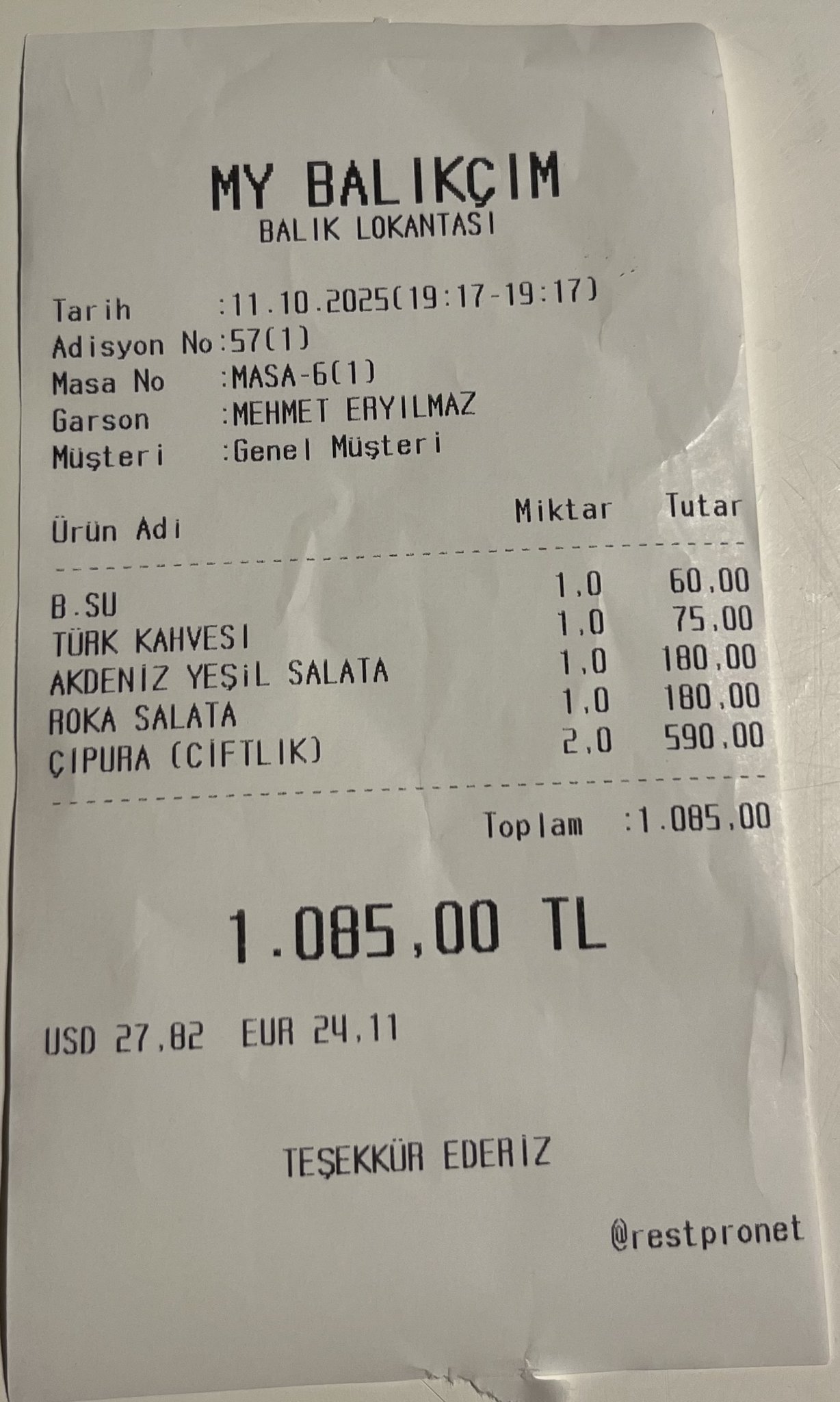 Снощи вечеряхме с жената за 1080 лири, две ципури за по няма и 12 лева всяка, салатите бяха по 7 лева и нещо, хляб, маслини, разядки дават безплатно…