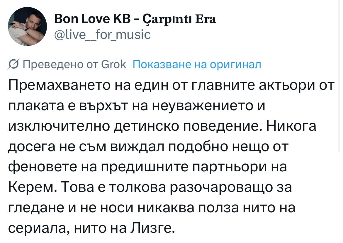 Феновете на Керем се обединяваме около това мнение: ( слагам и себе си, защото докладвах няколко от профилите на младата актриса, които споделят обработения постер и пишат обидни неща за Керем)
