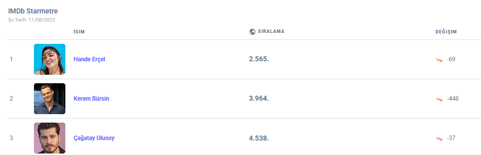 "Тази седмица #HandeErçel оглави класацията IMDb Starmeter. Тя се класира на 2565-то място от над 15 милиона души по целия свят, което я прави първа сред турските актьори."