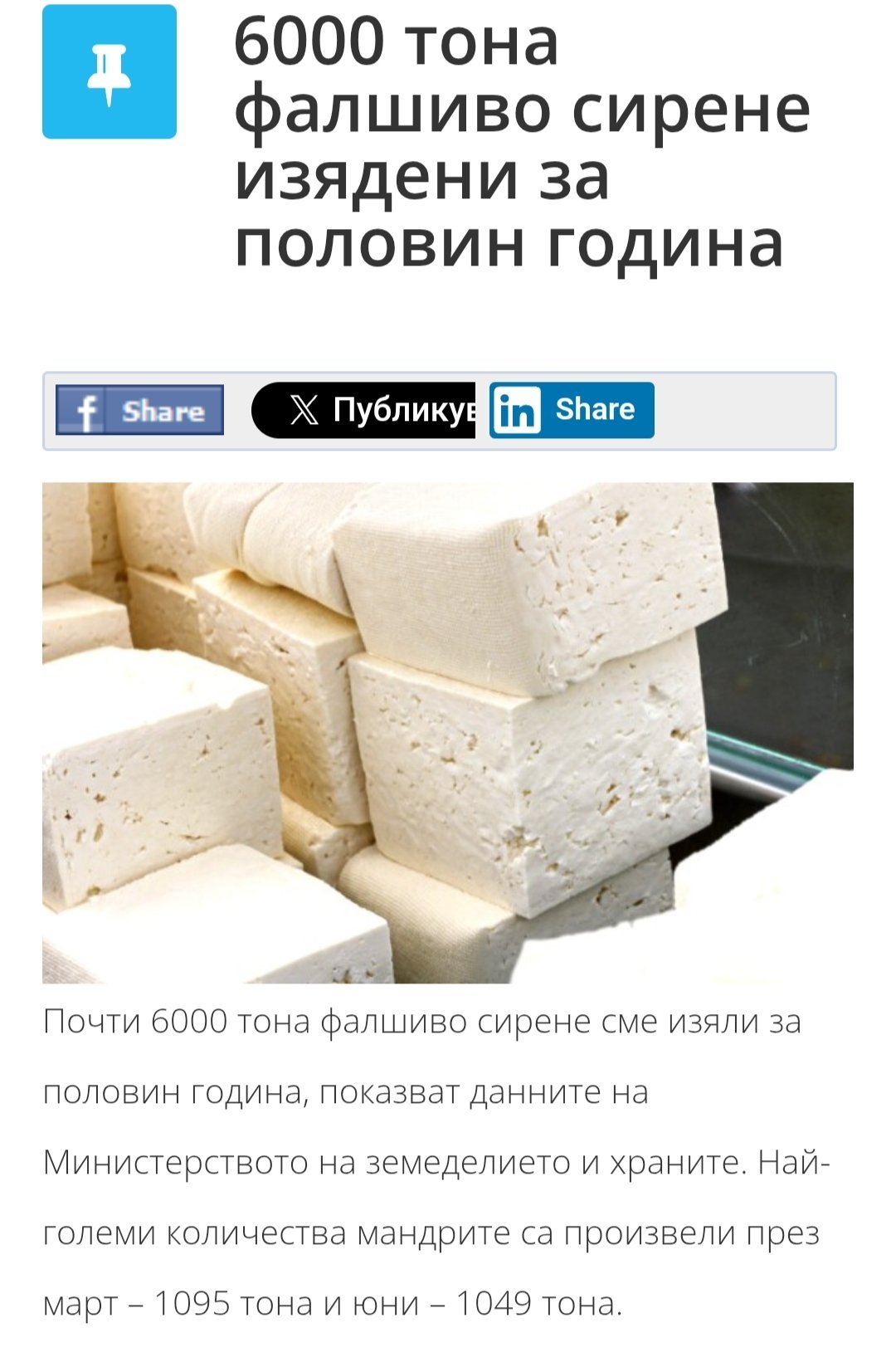 Тази информация се отнася за т.н. имитиращи продукти, в които има добавени растителни мазнини. Те са обозначени и това са официални данни . Никой не ви кара да купувате имитиращи - сирена по 10лв/кг. И никой не сравнява с техните цени тъй като са много по-ниски от продуктите само с мляко. Тук говорим за цените на утвърдените производители и по-горе дадох груба сметка колко излиза 1кг сирене и кашкавал само за цената на млякото.