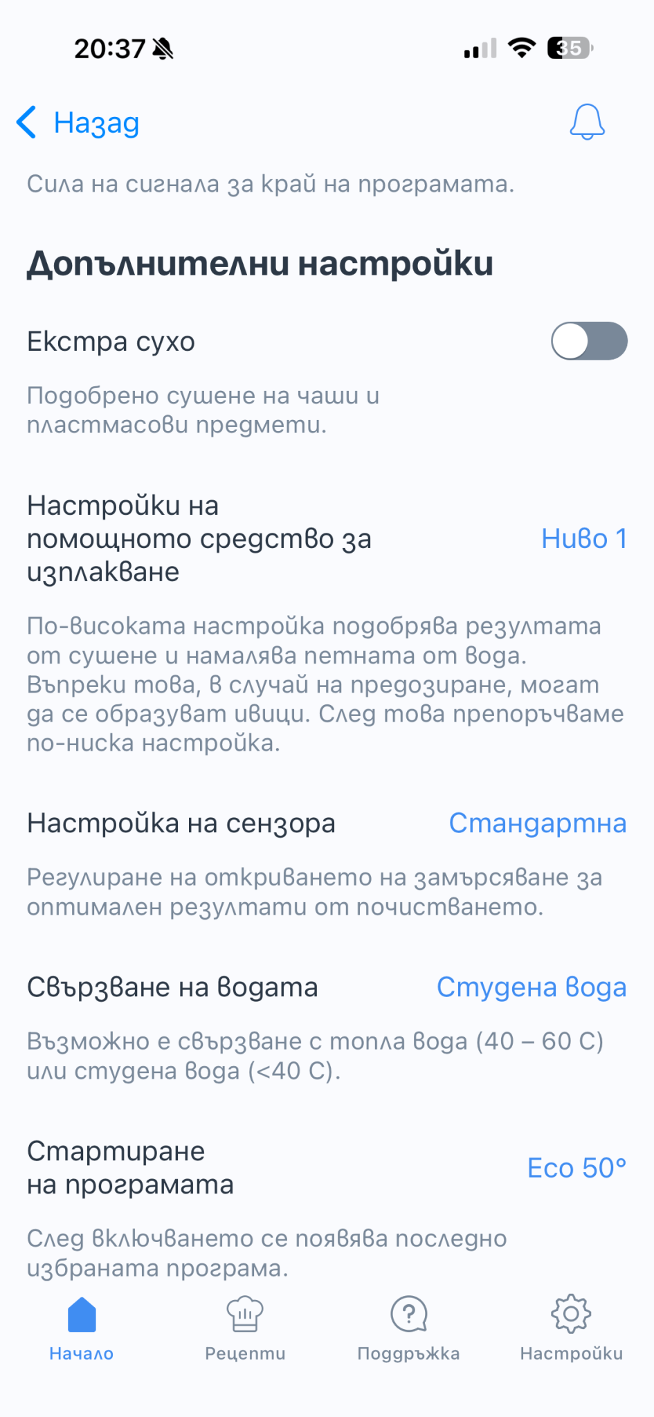 В настойки, когато е изключена допълнителната опция "Екстра сухо", тогава изтеглените програми ще бъдат съответно 29 мин, 1 час и т.н. Пиши като пробваш дали е станало.