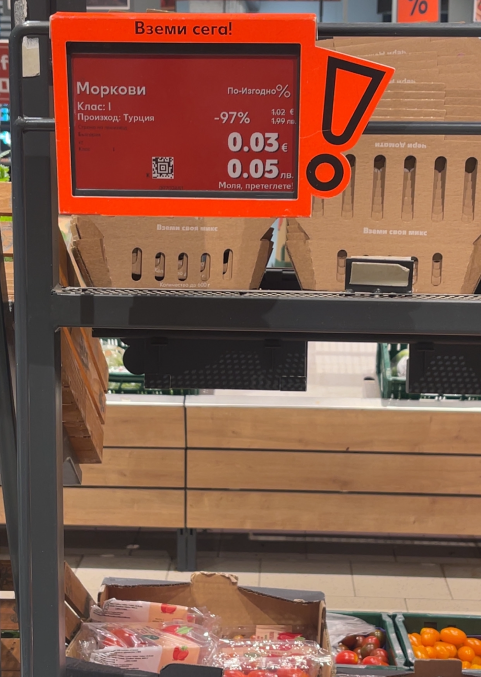 При нас бяха по 1,49 лв морковите. Но пък взех връзка моркови за 40 ст. Напоследък минавам съвсем набързо през плодовете и зеленчуците. Ядосах им се, че си съсипах един бял панталон заради черното им грозде.🙄 Та внимавайте особено около гроздето, че от онова черното направо беше потекло "вино" до долните рафтове (кой да предположи, като гроздето доста по-нагоре стоеше)!