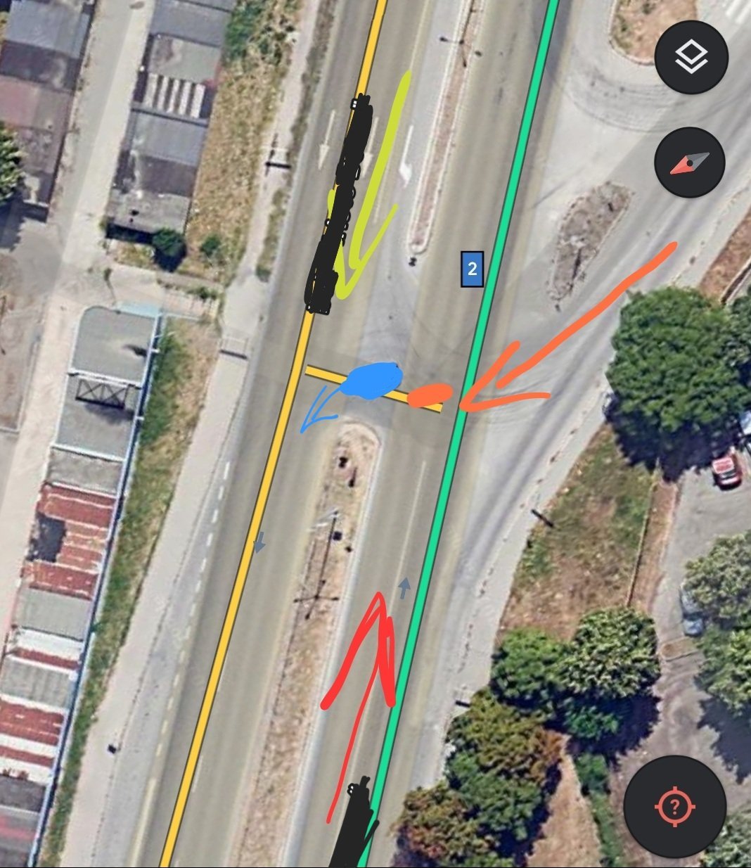Аз се движа по червената стрелка. В другото платно се движат коли по зелената. От дясно излиза синята кола и чака между двете платна, за да се включи в движението - има място за една кола там. Идва оранжевата кола и понеже няма къде да отиде - спира в платното и чака ред. Не видях имаше ли стикер, но столче имаше. Спрях и я изчаках, добре че нямаше коли зад мен. Толкоз за внимателните майки.