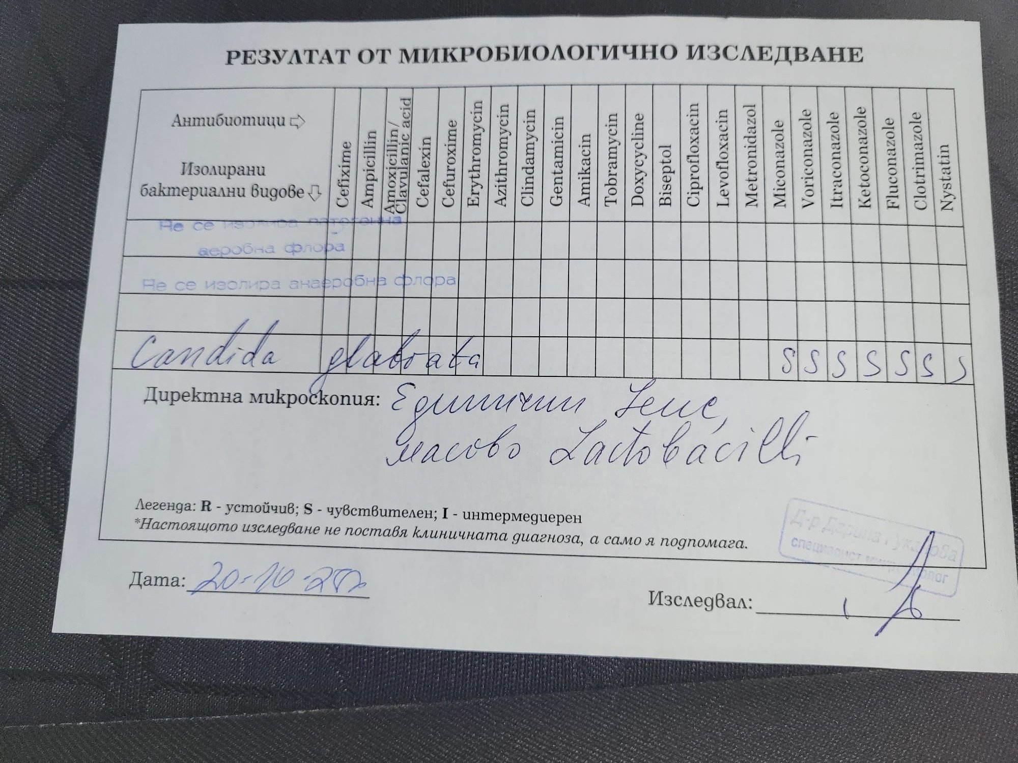 Момичета последни дни на подготовка за ЗЕТ съм . В петък ми е прегледа . Преди десетина дни на микробиологията излезнаха -масово candida glabrata. Ползвах три дни канестен гин . После настъпи цикъл и сега новата микробиология излиза ,че не са излекувани . Пратих резултатите в клиниката и чакам отговор от доктора . Но какво се прави в този случай ? Спира ли се всичко ? Кой медикамент е най-добър ? При този вариант на гъбичката има само вагинални продукти