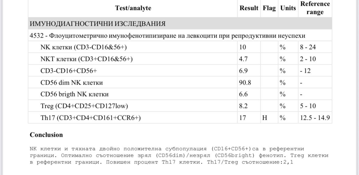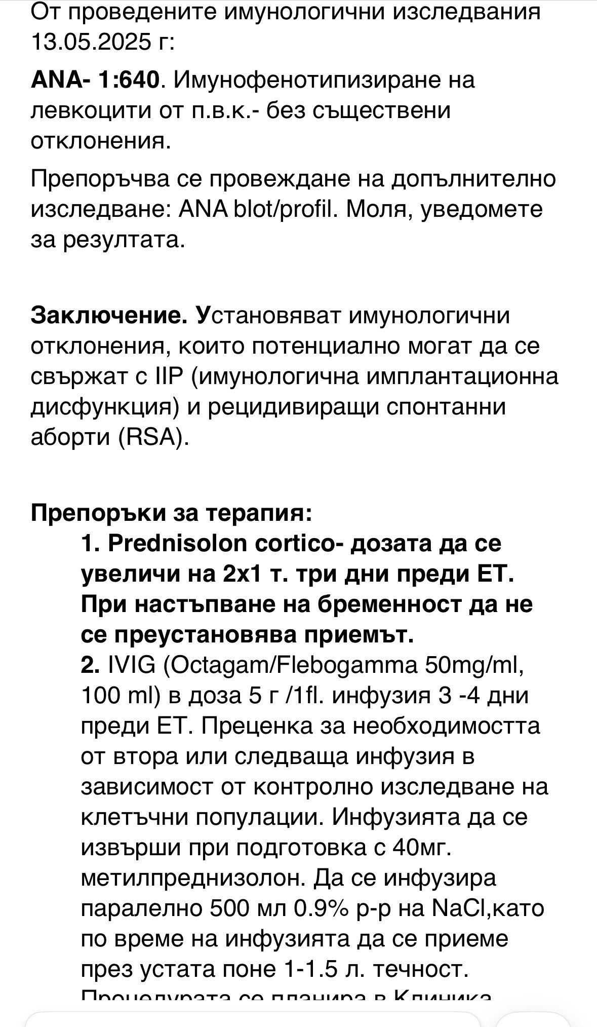 Стратегията с кортикостероида, той я приложи. Преди това бях в Щерев и след консулт с ендокринолог ми беше назначен глюкофаж, пак с идеята да потисне андрогени, но нямаше този ефект. Обсъдете и това с кожата, покажи му ако имаш плака по време на прегледа, както и при консулта с имунолог също го сподели. Аз бях на консулт при проф. Михайлова, когато и разказах всичко за мен, нейното мнение беше, че проблема ми не е имунологичен и не очаква да има проблем в изследванията. Но когато излязоха  TH17/Treg имаше намален брой TH17 спрямо увеличен Treg, което води точно до имплантационни неуспехи. След резултата Михайлова бързо си промени мнението, че не е имунологичен проблема и назначи вливка преди трансфер, както и контролна в 6-7 г.с Направихме две вливки- първата с първия трансфер, но резултата беше пак негативен. Втората с второто ембрионче, което имах, но тук Цветков искаше и лепило да сложим в матката два дни преди трансфер. Резултата за сега е положителен, в петък пуснах контролните изследвания и отново ако са извън норма ме очаква вливка. Ако трябва да съм честна аз също не вярвах, че имунологично е проблема, направих консулта и препоръките за да съм сигурна, че съм направила каквото трябва и да не съжалявам т.к това ни беше последното ембрионче. Затова е много важно да споделим всяка една подробност с лекаря, понякога незначителна за нас и дори за лекаря, накрая се оказва важна за крайния резултат!