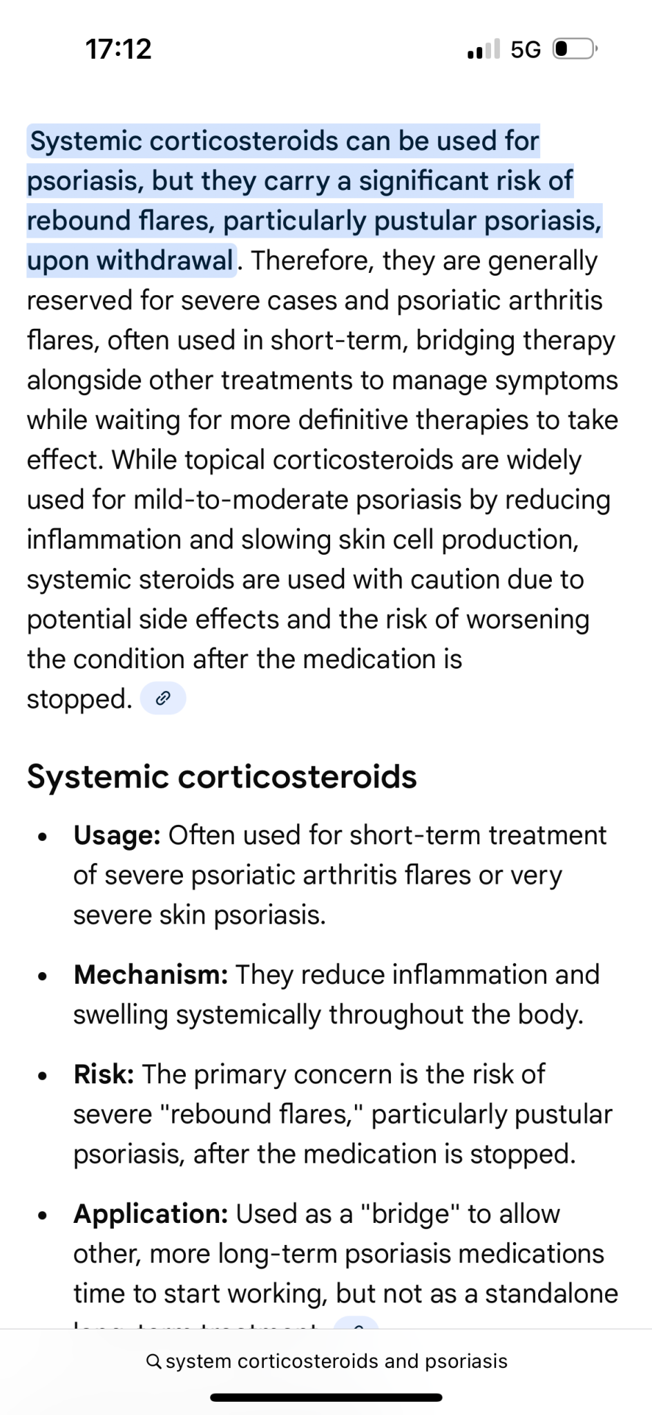 patty Ако смятате, че псориазиса не се лекува от дерматолог, защото е “вътрешно” заболяване, ако ще и от 50 години да го имате - нямате абсолютно никаква представа какво е това заболяване, кой го диагностицира и кой го лекува. Ако пък смятате, че системни кортикостероиди какъвто е медрол или преднизолон( които се изписват по време на стимулация) лекуват псориазиса, сте в още по-голяма грешка! Няма нито един гайдлайн - български, европейски или американски, който да препоръчва свободната употреба на системен кортикостероид при псориазис, освен в случаите когато има ангажирани стави! Като не вярвате на мен, поне не подвеждайте жените тук! Ето и едно елементарно търсене в гугъл какво ще каже за употреба на системен кортикостероид и псориазис
