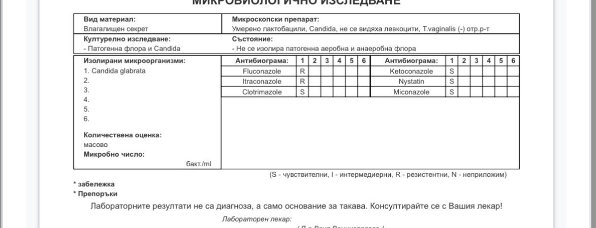 Здравейте, момичета! Най-накрая ми предстои инвитро, одобрена съм от ЦАР и чаках с нетърпение и се вълнувах. Доктора ми каза да си пуснем първо с мъжа ми разширени микробиологии. За съжаление на моята излезе гъбички Candida albicans ... има още 1 седмица докато ми дойде цикъла дали ще мога за 1 седмица да ги излекувам и ще се наложи ли да отложим инвитрото отново за следващия месец?
