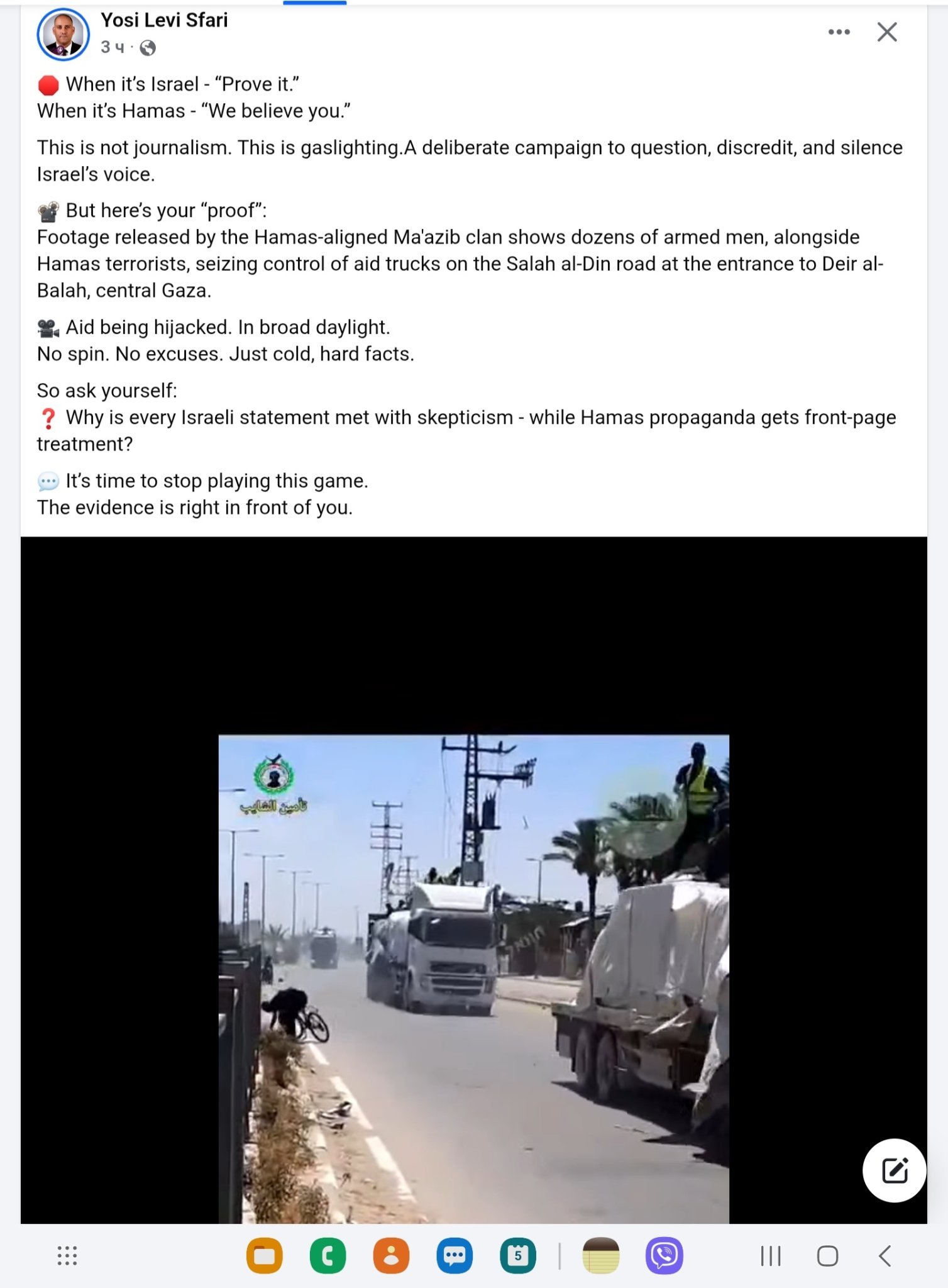 Кадри публикувани от Hamas-aligned Ma'azib clan показват дузина въоръжени мъже, заедно с терористи от Хамас, контролиращи камиона на пътя Салах А -Дин, на входа на Деир Ал Бала, централна Газа.