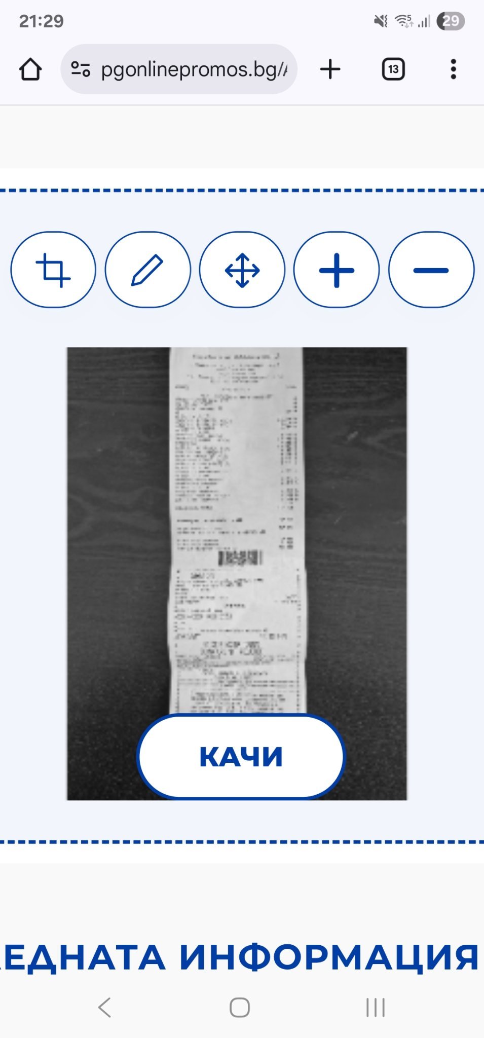 Здравейте, Ако има отрязък към бележката или допълнителен талон (Билла имат такива), снимайте и него, заедно с бележката. На мен веднъж не ми приемаха бележката, защото бях махнала допълнителния талон, а точно там беше баркода, който им трябваше.