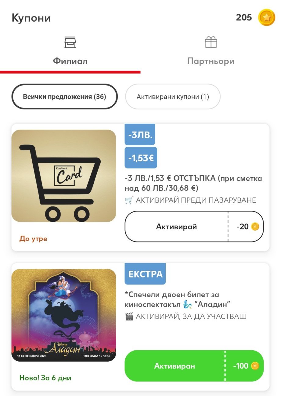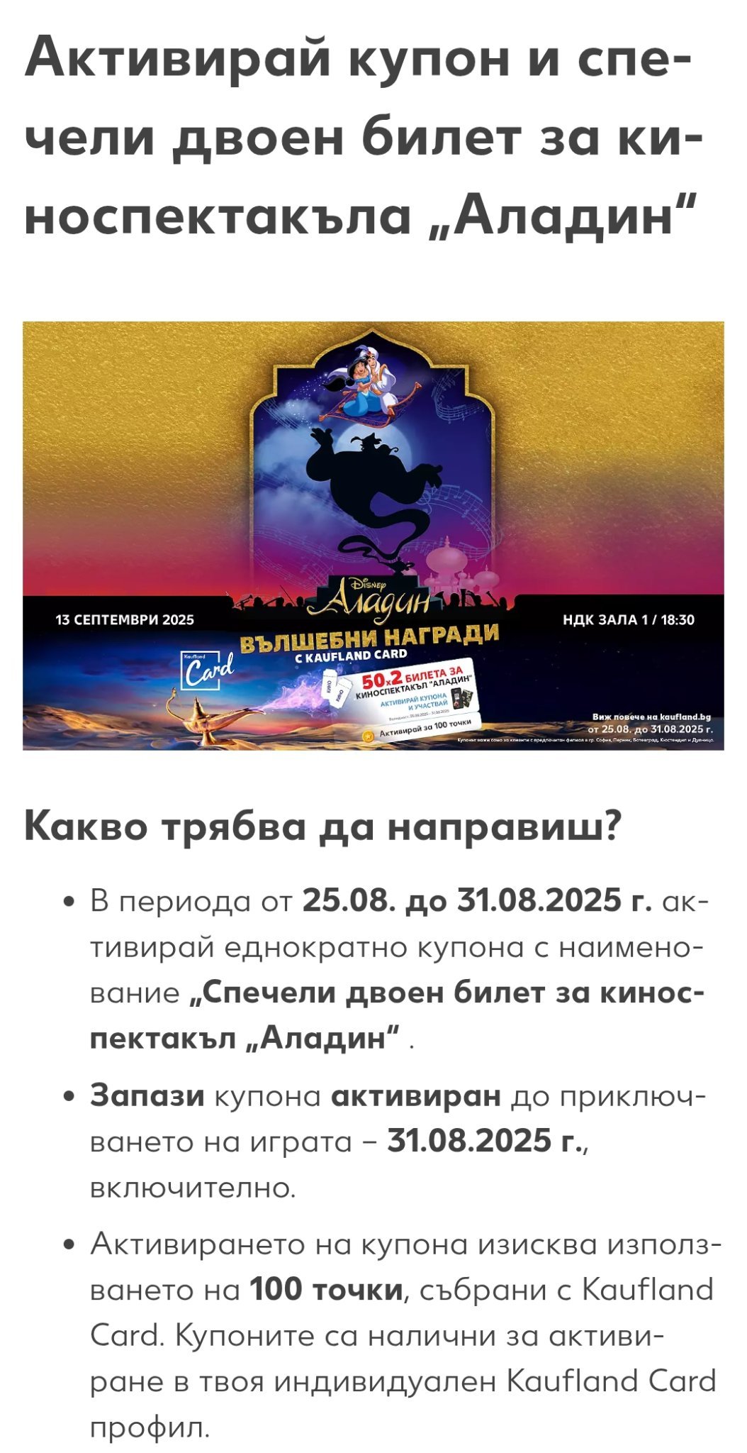 Голямата ми дъщеря ще се побърка от кеф, ако успея да уцеля от Кауфланд билетите за Аладин, но нямам достатъчно точки, защото доскоро използвахме 1 акаунт на различни телефони.