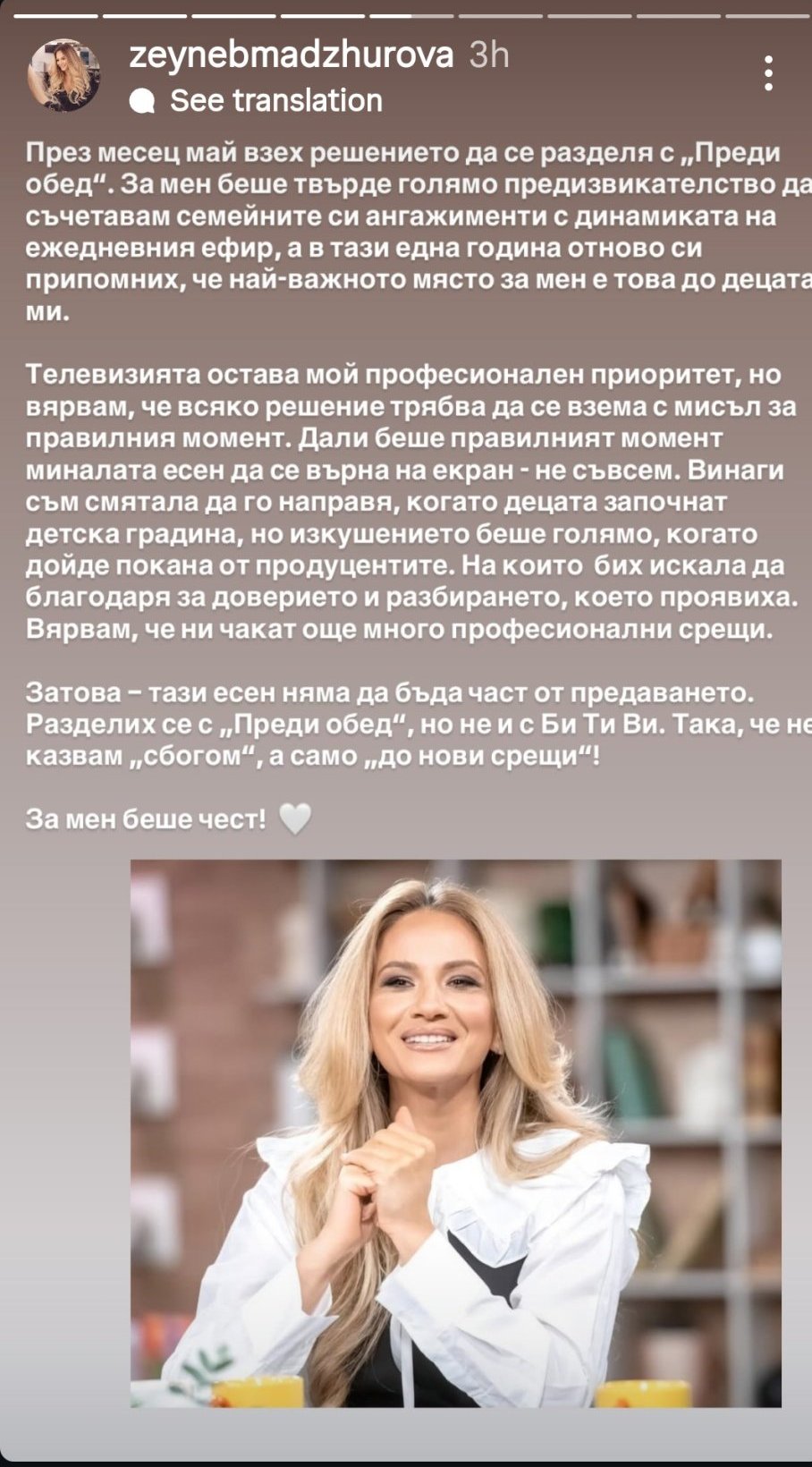 Не ми звучи убедително Зейнеб,уж не подходящ ангажимент заради малките деца, а се разделя с предаването, но Не  с БиТиВи, все едно друг проект очаква или пази Боже вече е поела.