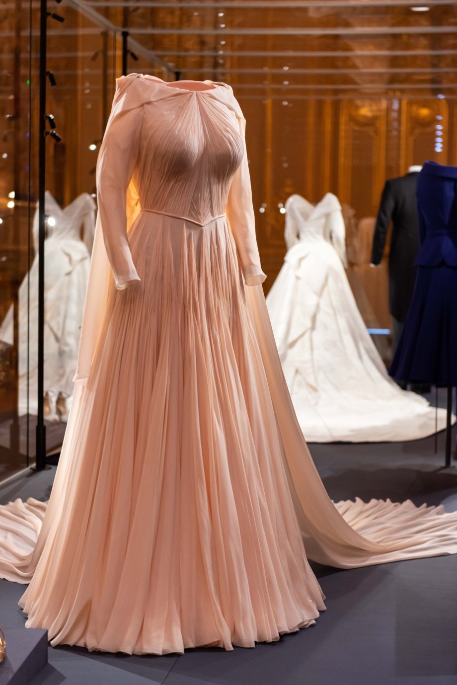 Роклята за вечерния прием също е много царствена и съобразена с това, че я носи принцеса. Изработена е от британски копринен шифон и включва пелерина, фино бродирана с бялата роза на Йорк, събрана в долната част на гърба и драпирана в меко плисиран шлейф по цялата дължина.