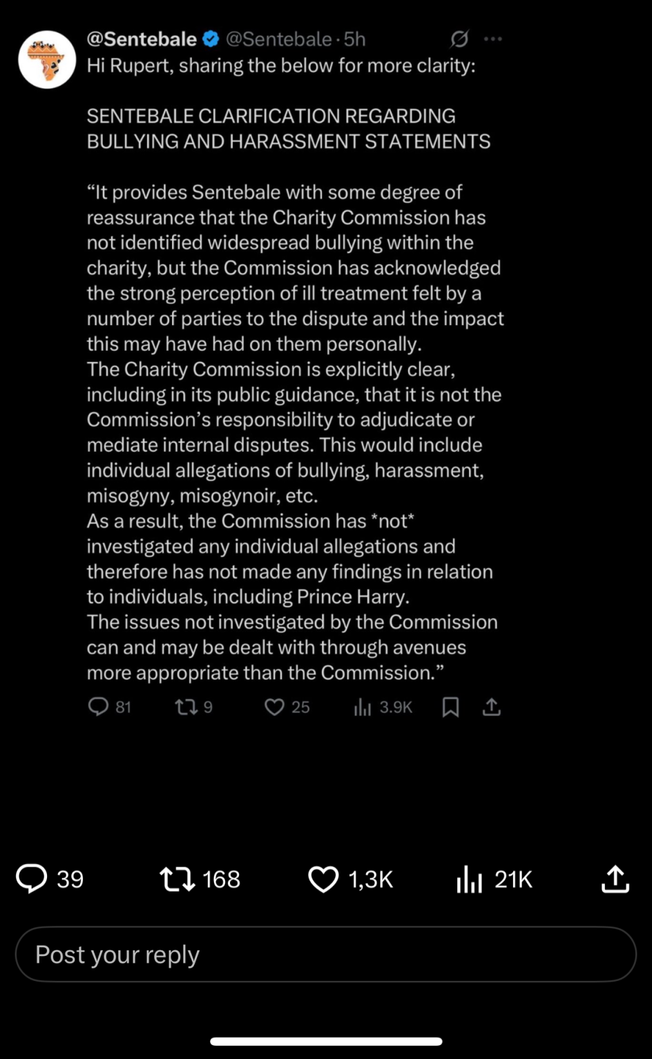 „Това дава на Sentebale известна увереност, че Комисията по благотворителност не е установила широко разпространен тормоз в рамките на благотворителната организация, но Комисията е признала силното усещане за малтретиране, изпитвано от редица страни по спора, и въздействието, което това може да е оказало върху тях лично.