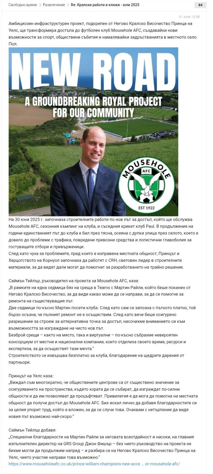 Миналия месец беше съобщено, че принц Уилям помага на футболен клуб с техния пътен проект, като улеснява ремонта на 50-годишния пътен проект!