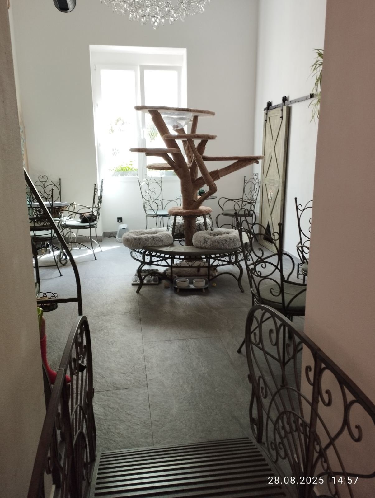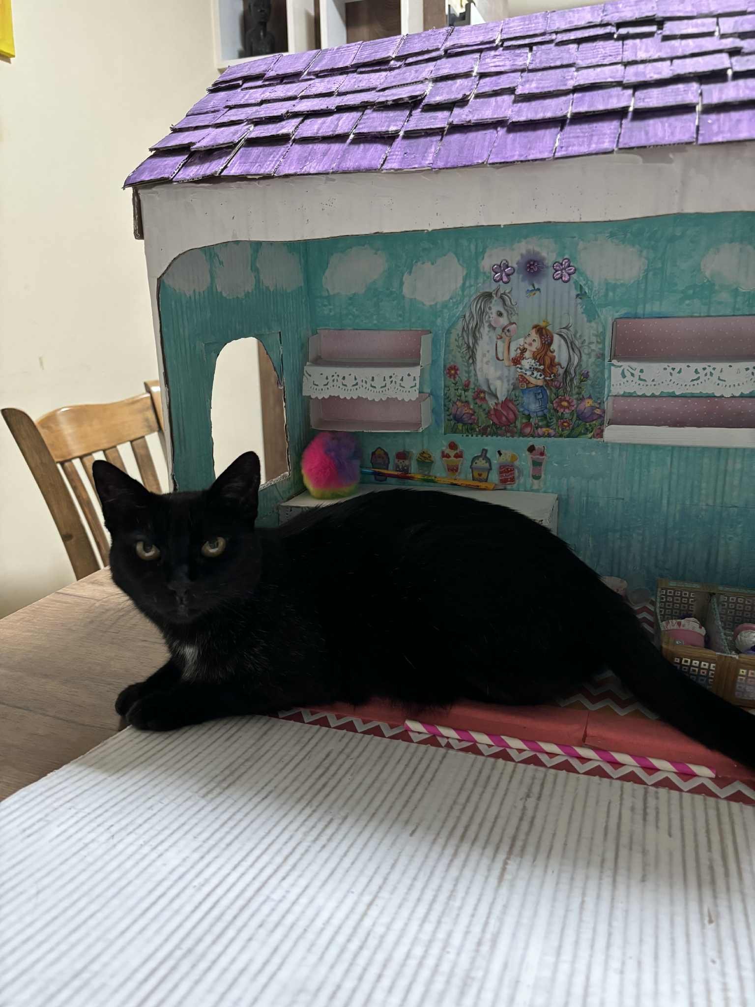 Да ви покажа Лусито - донесох си от гаража една къщичка за кукли, която преди време правих от кашони. Искам да я довърша. Лусито много си я хареса и веднага се самопокани вътре. А само да отбележа, че по принцип не се качва на масата. Но заради къщичката се качи.