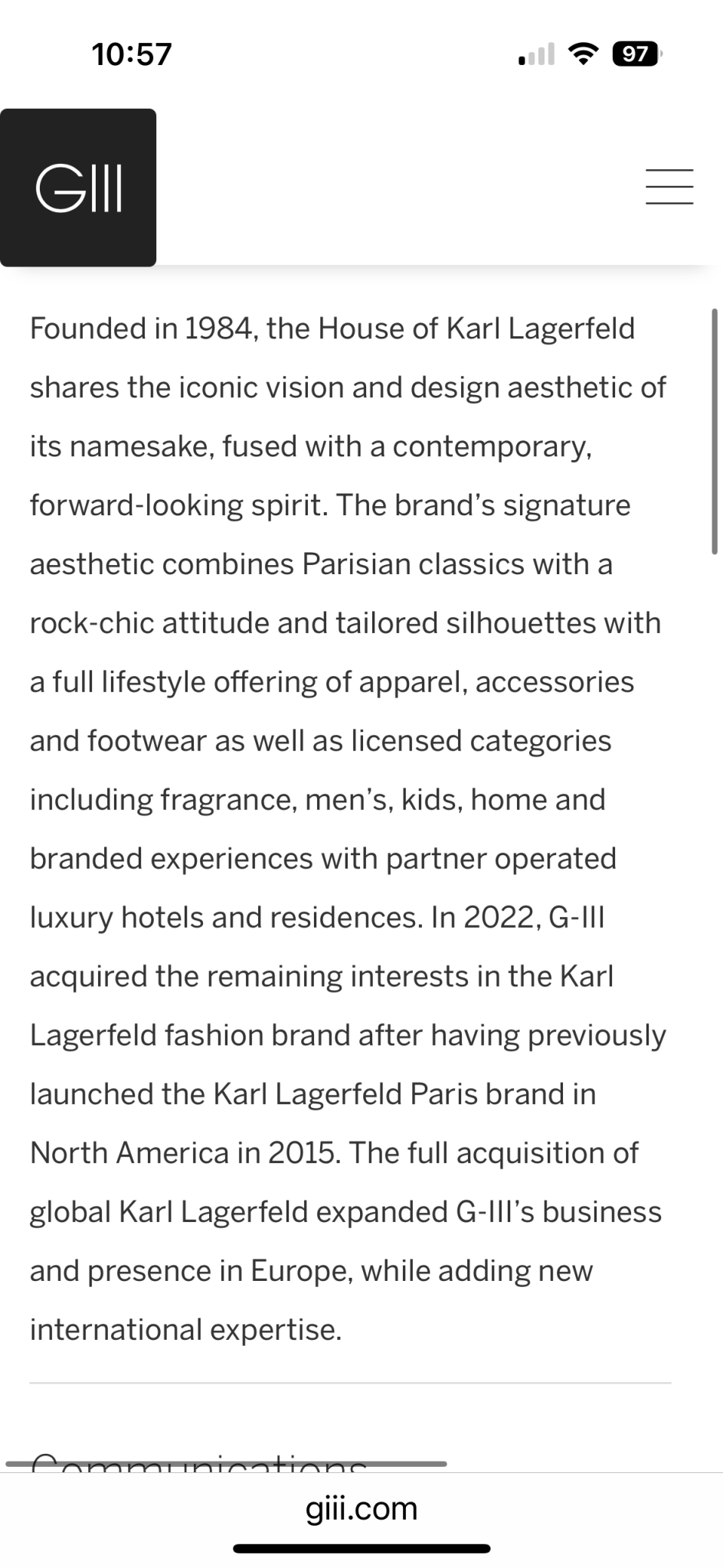 През 2022 г. G-III придобива оставащите дялове в модната марка Karl Lagerfeld, след като още през 2015 г. е стартирала марката Karl Lagerfeld Paris в Северна Америка. Пълното придобиване на глобалния бранд Karl Lagerfeld разширява бизнеса и присъствието на G-III в Европа, като същевременно добавя нов международен опит.