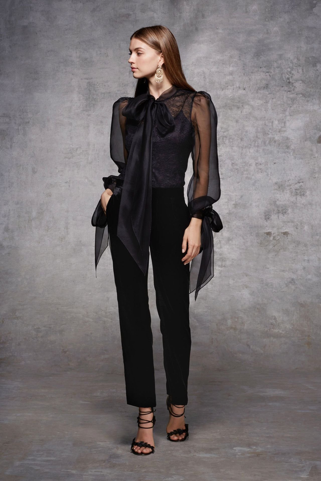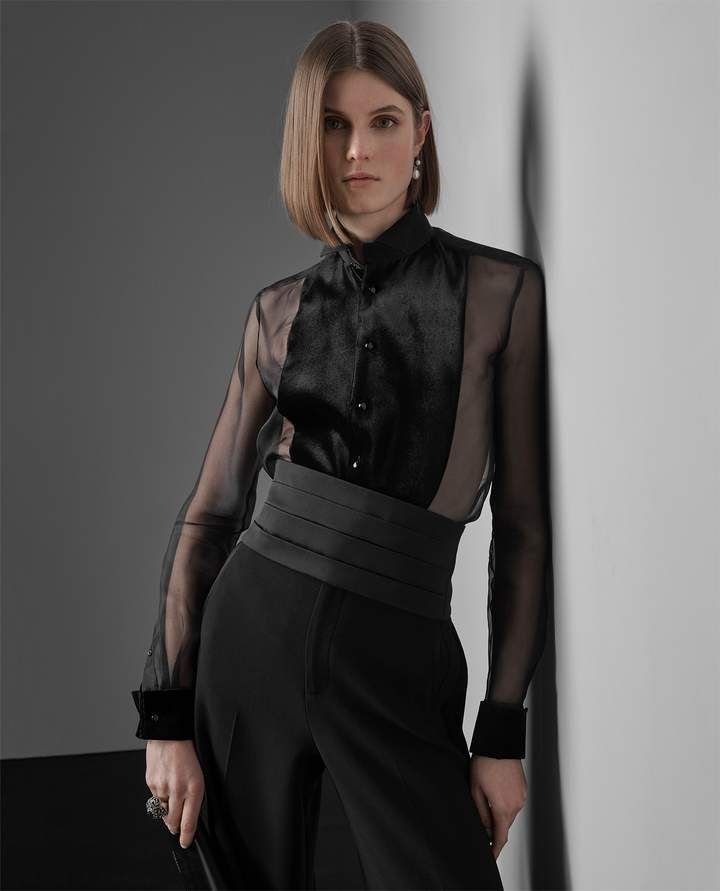 Тук бих търсила риза с идея за прозрачност, която деликатно би била прикрита в областта на торса с показания (или друг сходен) елек. Също бих наблегнала на интересен, богат и детайлен ръкав, който да прикове погледа.