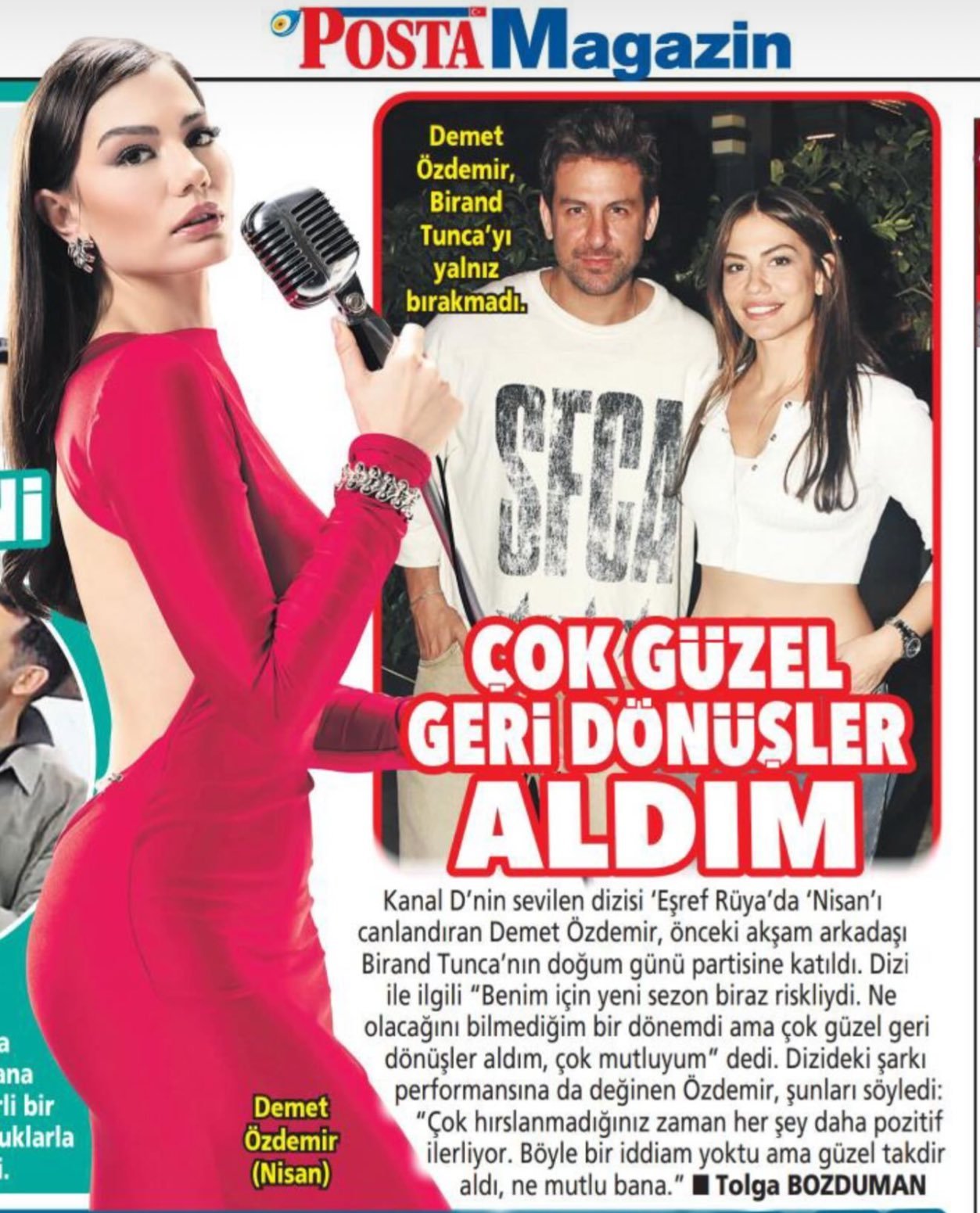 Демет Йоздемир, която играе Нисан в популярния сериал на Kanal D „Ешреф Рюя“, присъства на рождения ден на своя приятел Бирад Тунджа. Говорейки за сериала, тя каза: „Този нов сезон беше малко рискован за мен. Беше период, в който не знаех какво ще се случи, но получих толкова страхотни отзиви — много съм щастлива.“ Тя също спомена за своето пеене в сериала, казвайки: „Когато не си прекалено състезателен или амбициозен, всичко тече по-позитивно. Нямах големи претенции за това, но беше добре прието, което ме радва.“