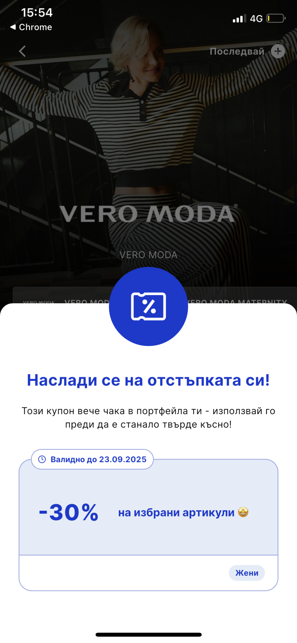 Тета, през телефон пробвай, на браузъра като ти излезе и кликаш на този пуст линк на веро мода и то ти казва, че ще ти даде купон за него -30, но дава за всичко избрано.