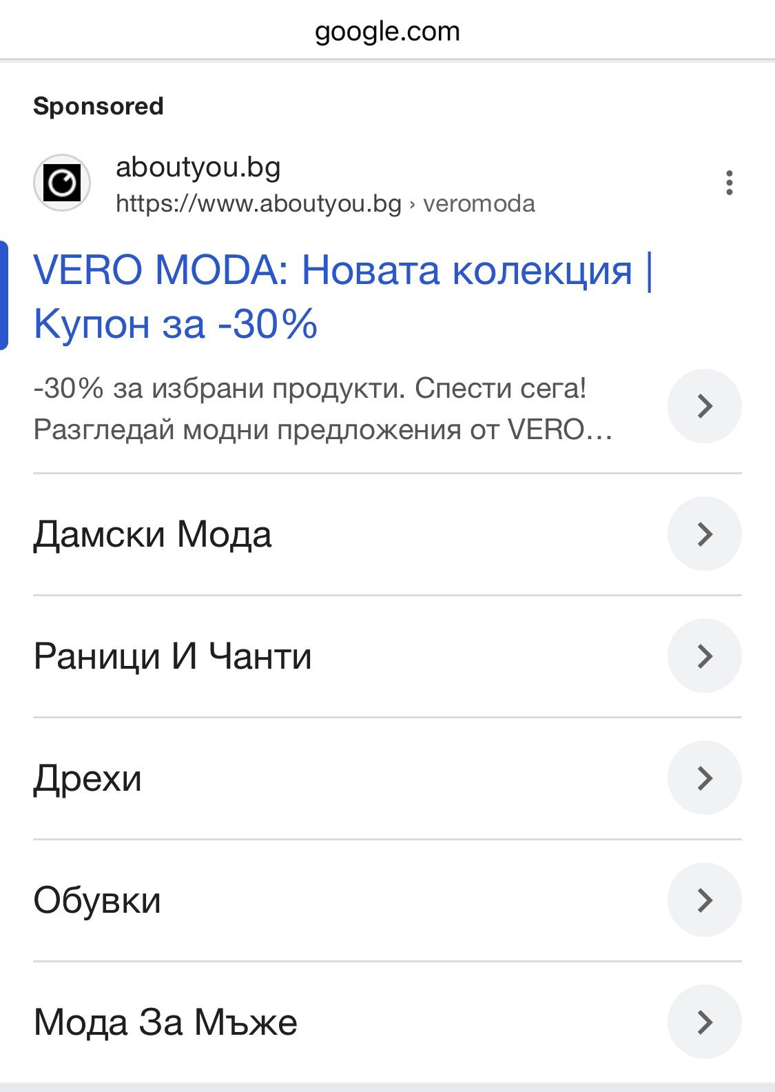 Няма значение дали е Vero Moda думата/марката.Сутринта го открих това,търсех едно яке на Ragwear и го видях и писах. После пробвах с други марки,пак се показва за дадената марка която търся в гугъл. Аз работя само през тела. За комп не знам. Отдавна не ползвам лаптопа,освен за работа. През тела в гугъл и ме праща в приложението.