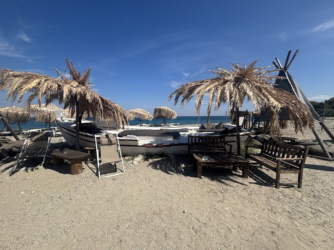 Най-близко ни беше Saoki beach bar. Много ми хареса. Не е класически бар на плажа. Просто разхвърляни стари мебели, или нещо самостоятелно сглобено. Фаворит на компанията ни беше стара лодка, която си ползвахме като шезлонги. Кеф голям. Музиката също много ми хареса. Даже съм си запазила някакви гръцки рапърски песни, които са ми много чил-аут.