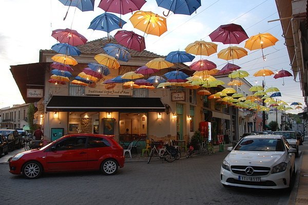Цялата улица е с шарени чадъри: