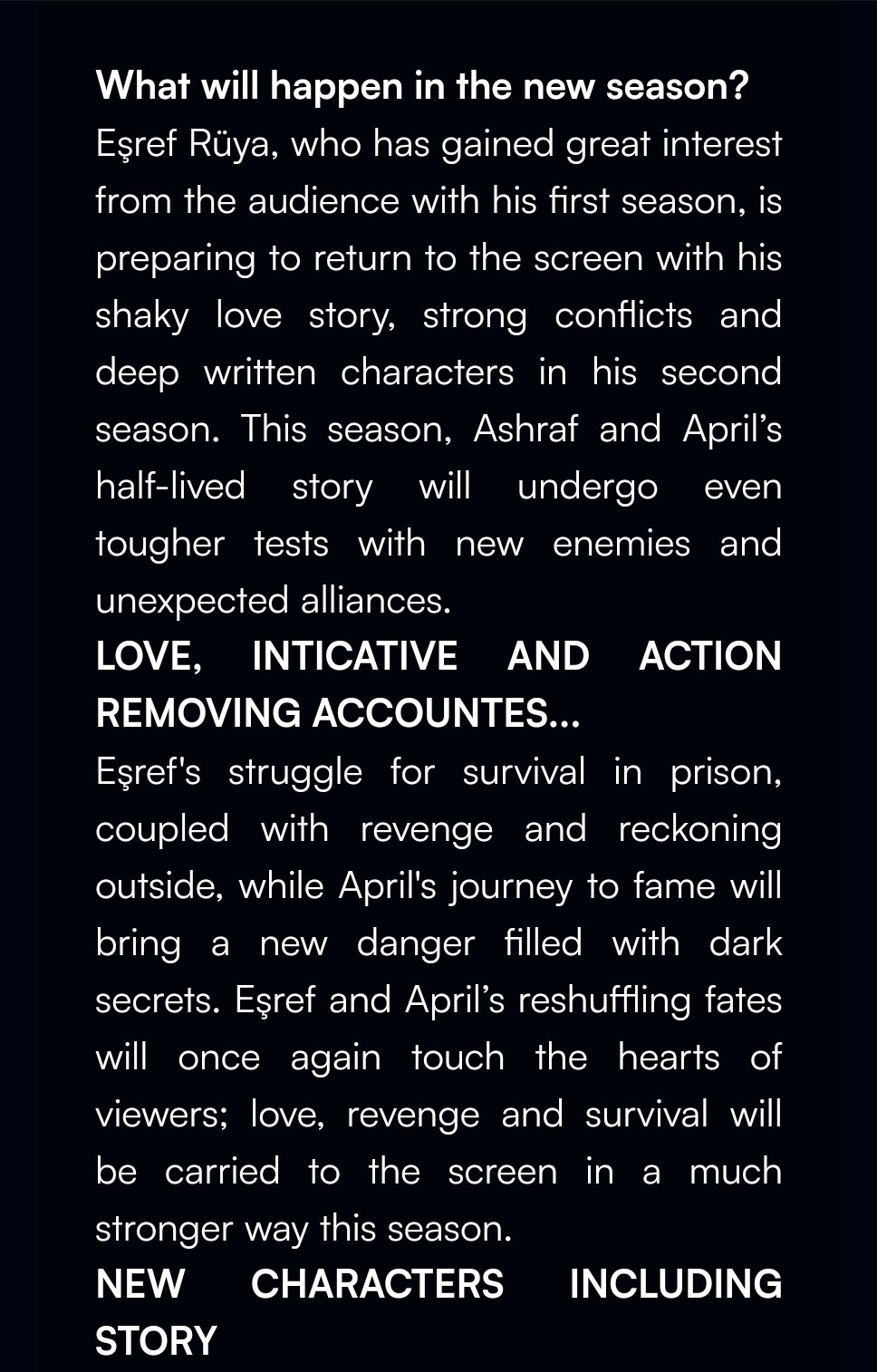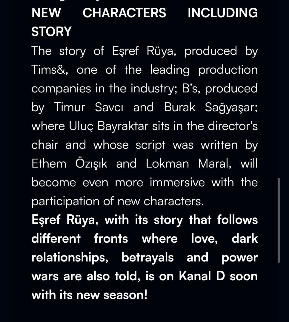 Историята на Ешреф Руя, продуцирана от Tims&, една от водещите продуцентски компании в индустрията; „B's“, продуциран от Тимур Савджъ и Бурак Сагяшар; където Улуч Байрактар ​​е на режисьорския стол, а сценарият е написан от Етем Йозъшък и Локман Марал, ще стане още по-завладяваща с участието на нови герои.